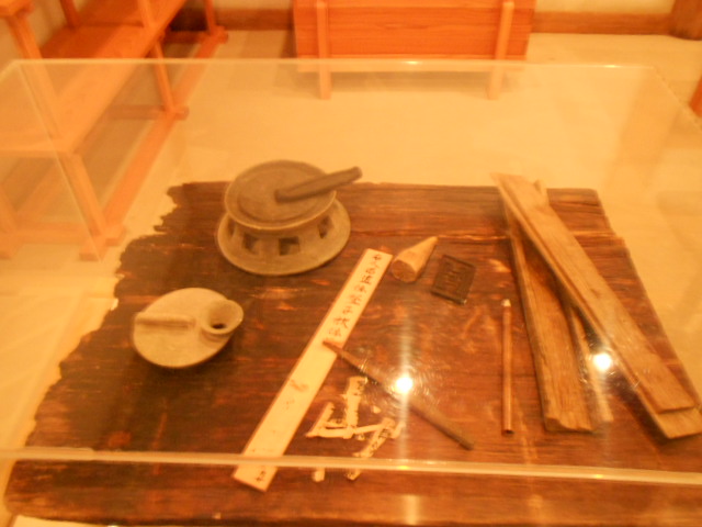 役人の三種の神器。硯に筆に木簡を削る刀子(とうす:小刀)。