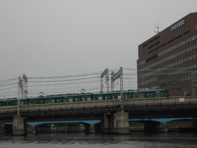 隣が日経新聞のビル。側を走る京阪電車