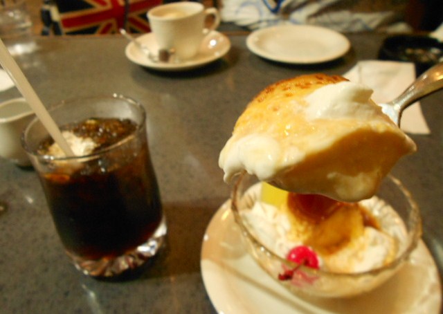 川沿いの景色を楽しんだ後、た~がプリン食べに行こと商店街の中の昔ながらの喫茶店に連れていかれました。