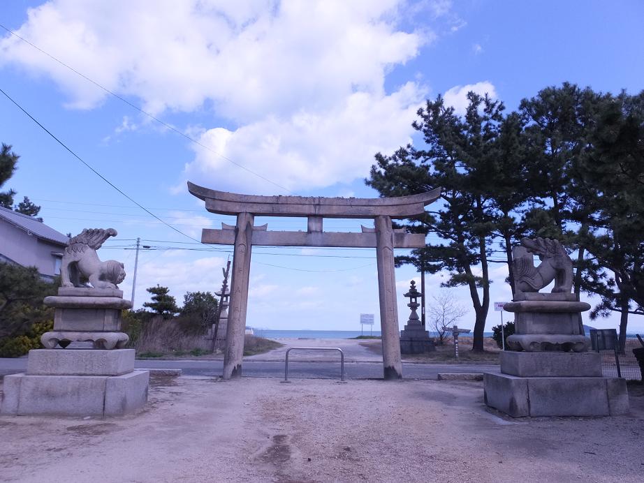 菅原道真が太宰府へ向かう途中、嵐に遭いこの浜に流れついたそうです。突然の事で地元の人たちは準備がなにも出来ていなかったので、漁で使う網を敷き物にして道真を出迎えたそうです。それがこの神社の名前の由来です。