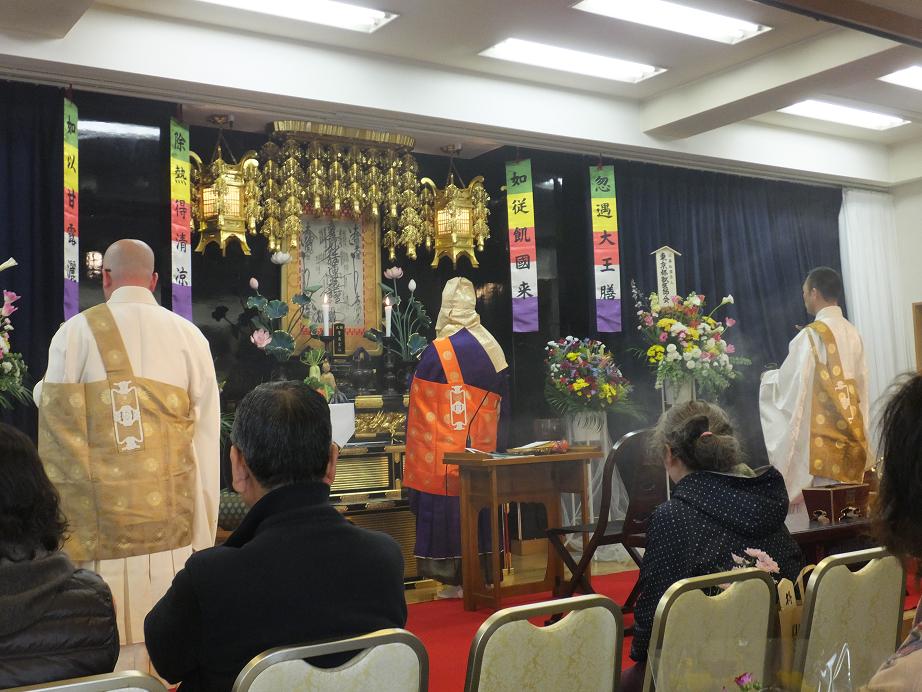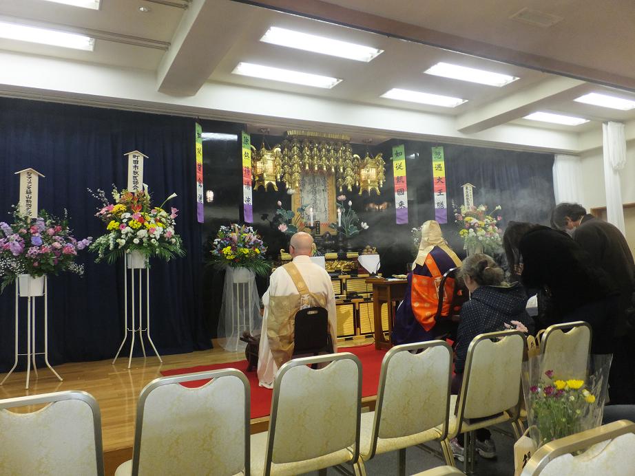 席は既に満席。外にもパイプ椅子が並んでました。お坊さんの法話が始まっていました。