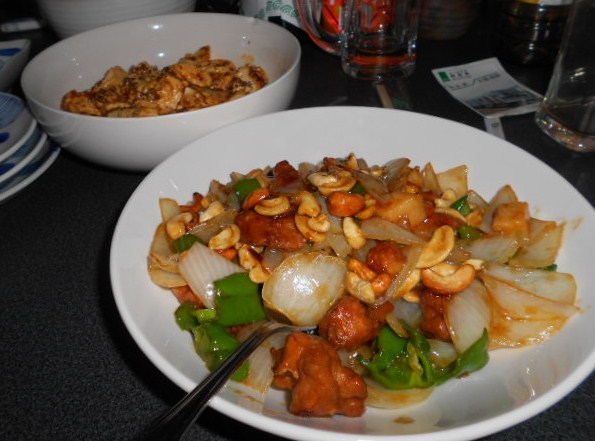夕食はカシューナッツと鶏肉の炒め物、麻婆豆腐とシュウマイでした。(手抜きです)