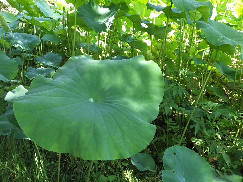 一週間まえから蓮が咲き始めたそうですが、早朝にしか咲かないので昼間は見れないそうです。でもとりあえず行ってみました。大分背が高くなってちっちゃな池に密集してます。