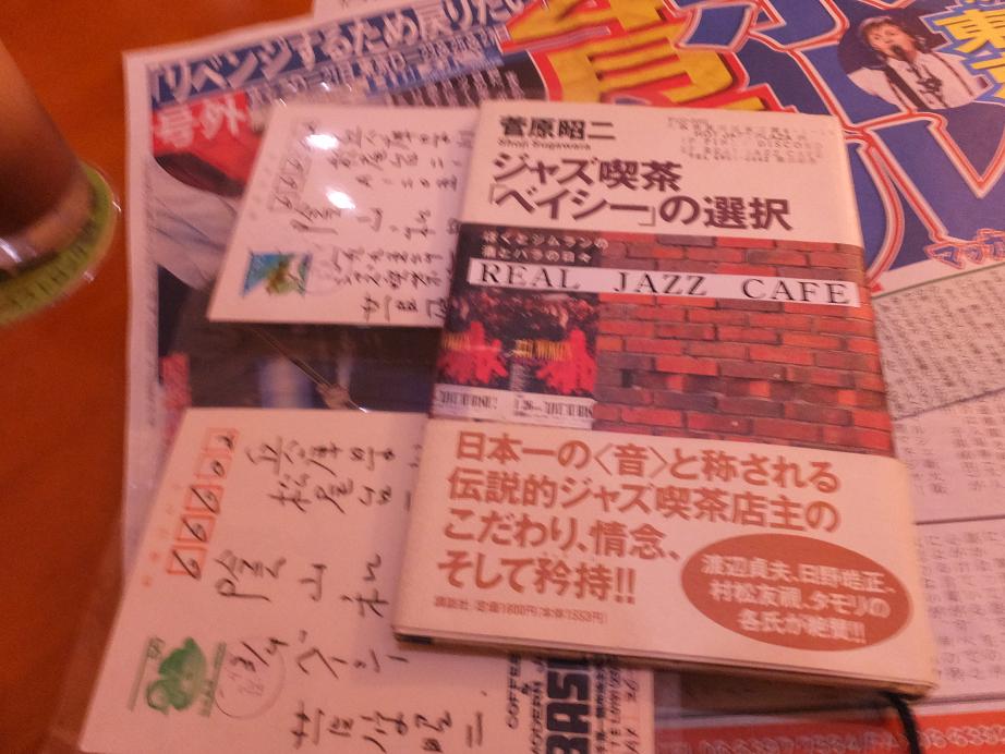 「ベイシー」のオーナー、菅原昭二さんの本と年賀状も見せてくれました。