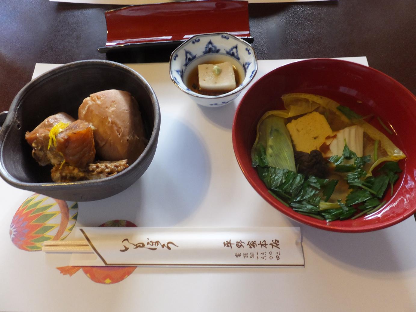 ごま豆腐にお吸い物。これにご飯と香の物が付きます。大きなお椀のお吸い物はひとくちすすると幸福感がひろがってくるなー。大きな湯葉も入ってます。
